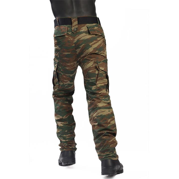 Έχει δύο τσέπες μπροστά δύο πίσω και 2 μεγάλες cargo στους μηρούς. Διπλή ενίσχυση στα γόνατα και στην περιοχή της έδρας. Ιμάντες σύσφιξης την μέση και το κάθε μπατζάκι έχει κορδόνι στο κάτω μέρος. Χρώμα, αντοχή, σχέδιο και ποιότητα προδιαγραφών Ε.Σ.
