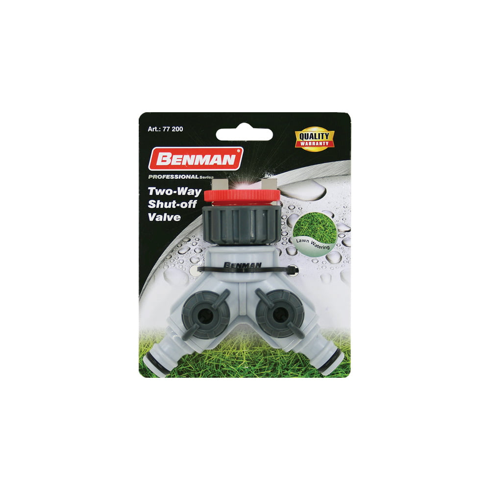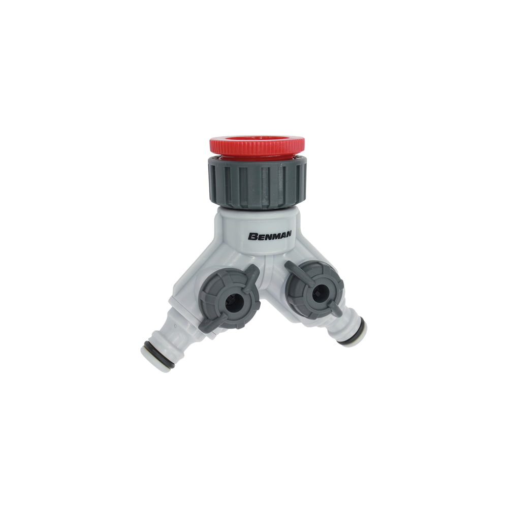 Συστολή με διπλή έξοδο BENMAN 45 μοιρών. Συνδέει τη βρύση με δύο ταχυσύνδεσμους ποτίσματος. Διαθέτει δύο ανεξάρτητους διακόπτες.